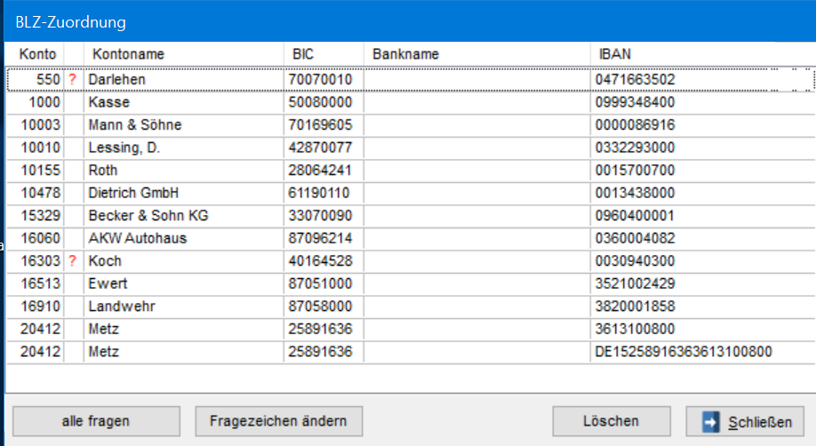 BLZ-Zuordnung: Hier gelangen Sie in die Verwaltung der gespeicherten Bankverbindungen. Hier werden alle bereits bekannten IBANs oder Kennungen angezeigt, die in bisherigen Imports erkannt oder manuell zugeordnet wurden. Diese Liste kann direkt bearbeitet werden. Falls alte oder ungültige Einträge enthalten sind, können Sie diese hier löschen. Wenn für eine bestimmte Bankverbindung keine automatische Verbuchung gewünscht ist, können Sie ein Fragezeichen hinterlegen. Dies bewirkt, dass Profin bei dieser Verbindung grundsätzlich nachfragt, bevor eine Buchung ausgeführt wird. So behalten Sie auch bei sensiblen Konten die volle Kontrolle.