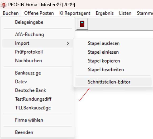 - Nun konfigurieren Sie die vorbereitete Schnittstelle im Schnittstellen-Editor (Buchen->Import->Schnittstellen-Editor)
