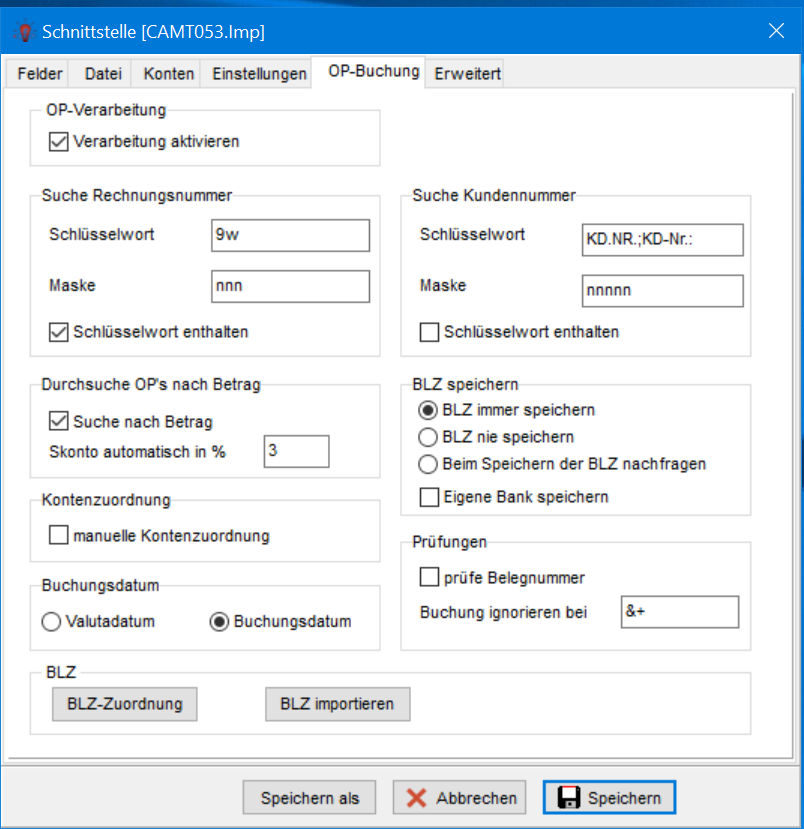 Für die Konfiguration wechseln Sie im Schnittstellen-Editor auf das Register OP-Buchung.